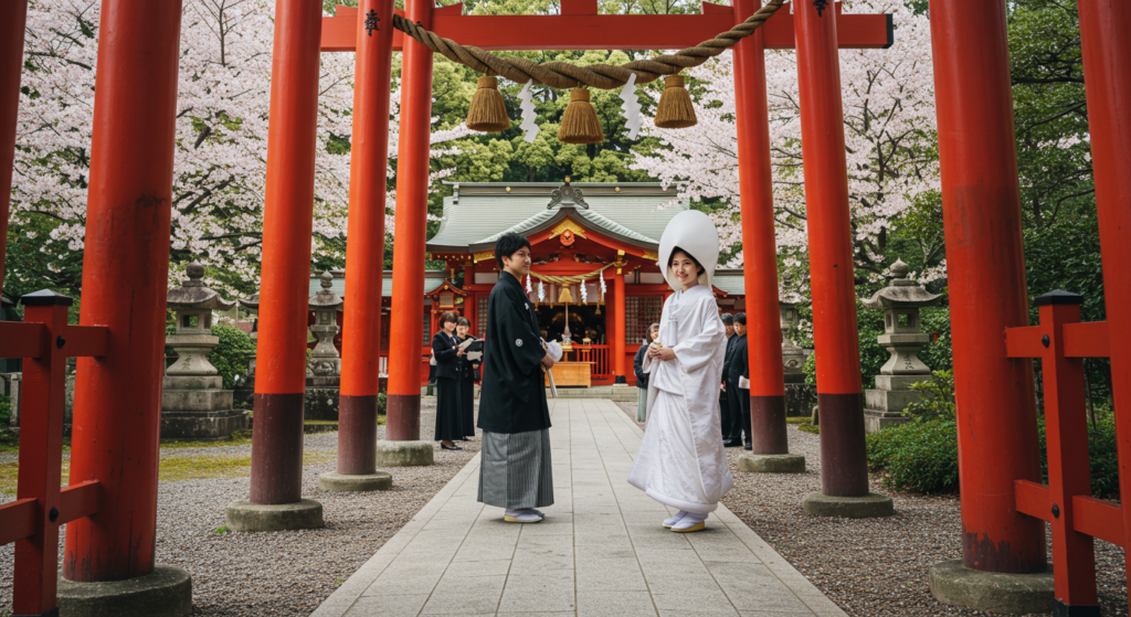 神前式は、白無垢姿が最も映える伝統的な挙式スタイルです。神社の厳かな雰囲気と、白無垢の清らかさが見事に調和します。三三九度の儀や玉串奉奠など、日本古来の儀式を通じて、神前で夫婦の誓いを立てることができます。