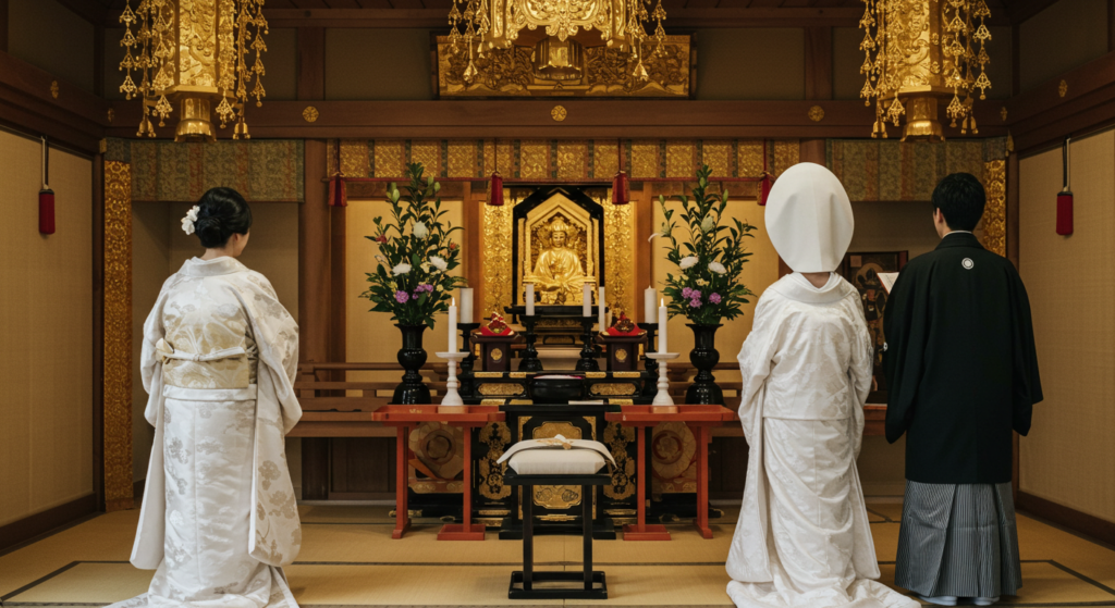 仏前式は、落ち着いた雰囲気の中で執り行われる挙式スタイルです。白無垢姿で仏前に向かい、ご本尊の前で夫婦の誓いを立てます。読経の中で行われる儀式は、心が清められるような厳かな雰囲気です。